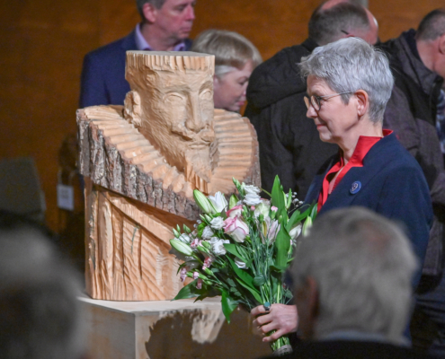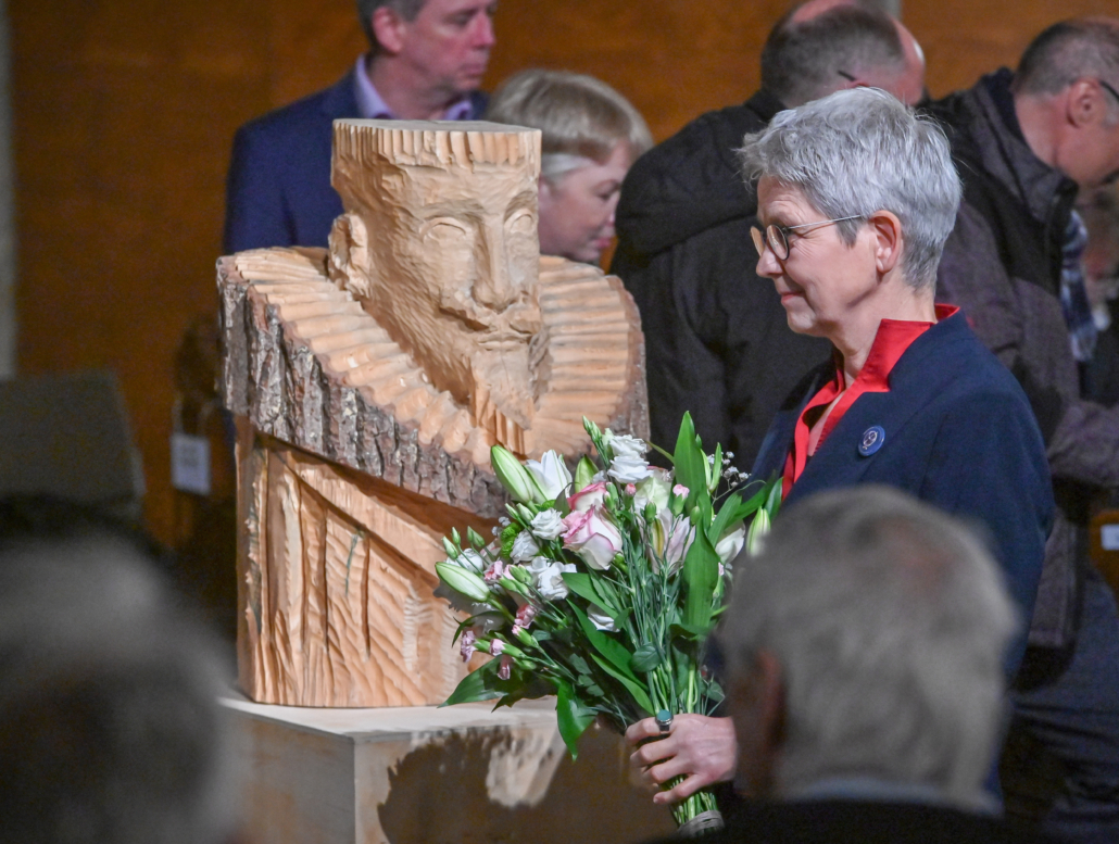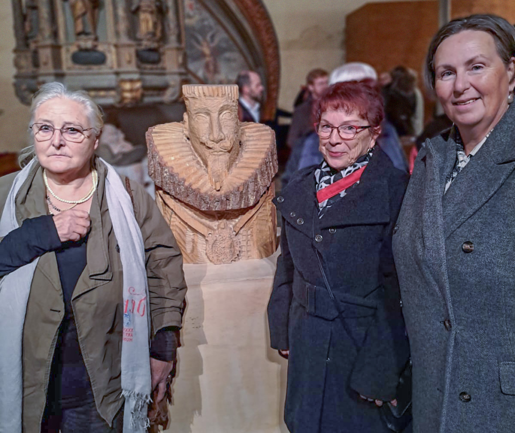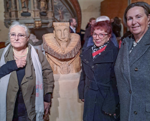 Und selbst am Tag ihrer Verabschiedung kommt die Umtriebige mit einer Idee, nämlich einem Geschenk für den Festivalspielort Zeitz – Heinrich Schütz in Holz. So der Stadtrat zustimmt, wird die Holzplastik von Anna Franziska Schwarzbach künftig auf Schloss Moritzburg einen würdigen Platz einnehmen. Schließlich hat Heinrich Schütz unter Herzog Moritz als Hofkapellmeister von Hause aus gewirkt und kehrt so an einen authentischen Ort zurück. Sehr zur Freude von Kristin Otto (rechts im Bild) und Gudrun Hartmann (Bildmitte). „Für uns in Zeitz bleibt das Heinrich Schütz Musikfest mit dem Namen Christina Siegfried verbunden“, sagte die Vorsitzende des Fördervereins Musikfreunde EULE-Orgel Zeitzer Dom e.V..