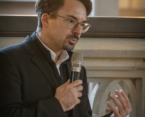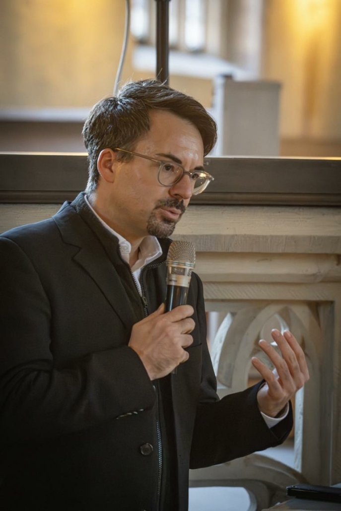 Dreh- und Angelpunkt des HEINRICH SCHÜTZ MUSIKFESTs 2025 war artist in residence Gregor Meyer (*1979). Gemeinsam mit „seinen“ Ensembles – dem GewandhausChor und dem Ensemble 1684 – sowie weiteren hochkarätigen Künstler:innen präsentierte der in Leipzig beheimatete Chor- und Ensembleleiter, Organist, Pianist, Komponist und Arrangeur in fünf Konzerten vier außergewöhnliche, speziell für seine Residenz entwickelte Programme. Gregor Meyer: „Für mich waren die vergangenen zwei Wochen als artist in residence beim HEINRICH SCHÜTZ MUSIKFEST 2025 eine unglaublich bereichernde Erfahrung. Die vier Programme haben mich herausgefordert und mir zugleich enorm viel neuen künstlerischen Spielraum gegeben. Ich bin dankbar für all die Begegnungen mit so zugewandten Menschen und dafür, dass ich so vieles ausprobieren durfte, was mich wirklich weitergebracht hat.“